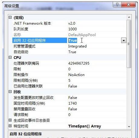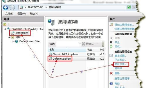 返回,點(diǎn)擊左邊應(yīng)用程序池節(jié)點(diǎn),查看剛才使用的應(yīng)用程序池的高級屬性(這里是DafaultAppPool)