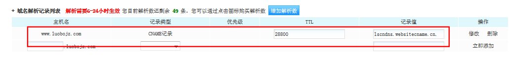 4,點(diǎn)擊域名解析,鍵入主機(jī)名為www 記錄類型選擇cname,錄入在站點(diǎn)信息中得到的cname記錄值并以" . "結(jié)尾