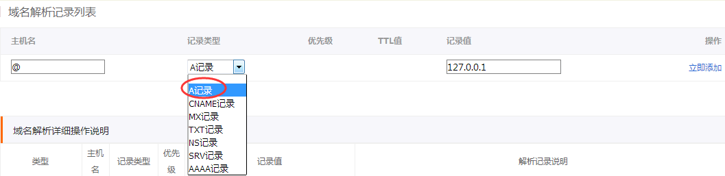 主機(jī)名填寫@,記錄類型選擇A記錄,記錄值填寫主機(jī)IP地址。如下圖: