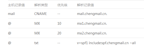 | @ | TXT | v=spf1 include:spf.mxhichina.com -all |