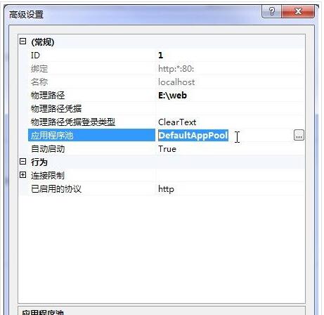 返回,點(diǎn)擊左邊應(yīng)用程序池節(jié)點(diǎn),查看剛才使用的應(yīng)用程序池的高級屬性(這里是DafaultAppPool)