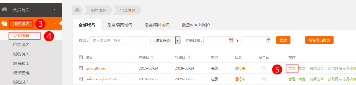 1 以注冊會員登陸后點(diǎn)擊域名管理