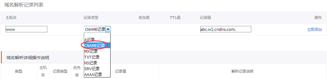 主機(jī)名填寫www,記錄類型選擇CNAME記錄,記錄值填寫主機(jī)贈(zèng)送的三級(jí)域名。如下圖: