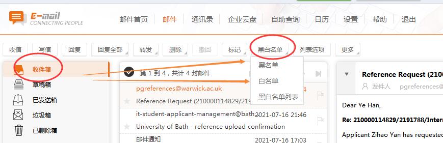 3、進(jìn)入“收件箱”頁后,在上方一排按鈕中有個(gè)“黑白名單”,先下右下角小三角